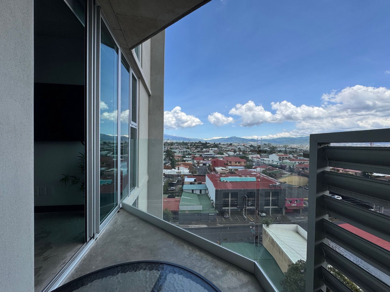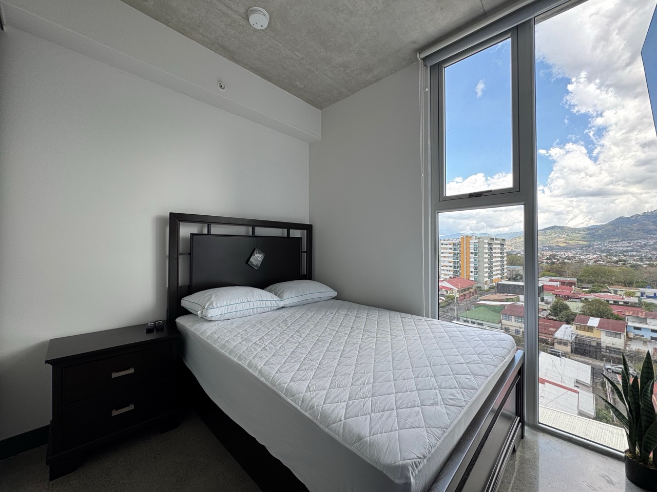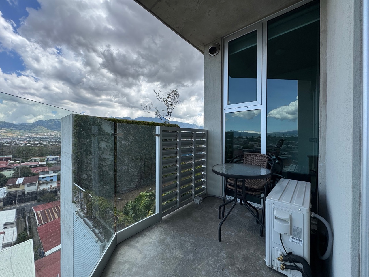 Distribución: 2 habitaciones, 1 baño completo y 1 parqueo. Ubicado en el piso 9, esta unidad destaca por ser más amplia que el promedio, con un balcón extendido y vistas a las montañas de Escazú.