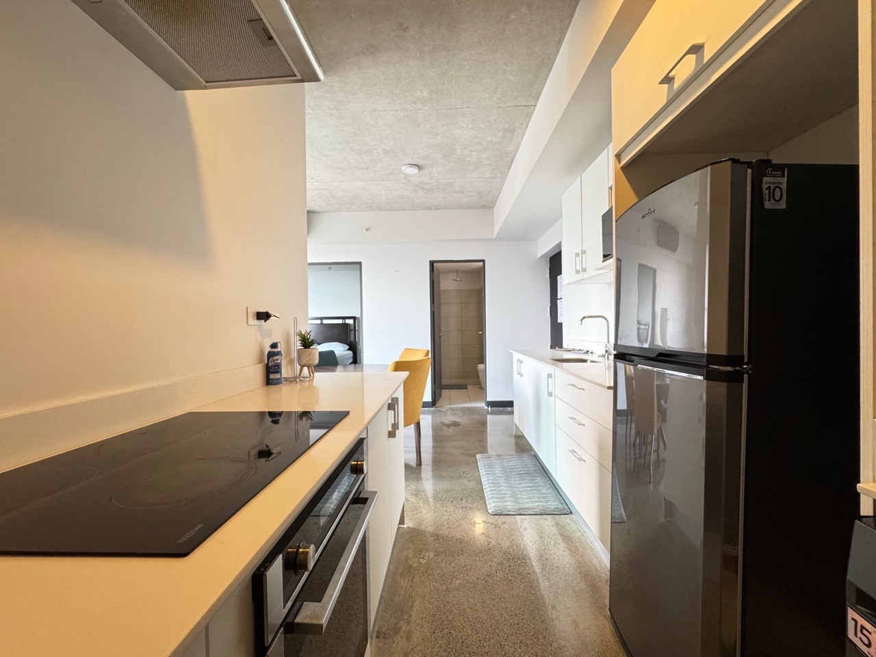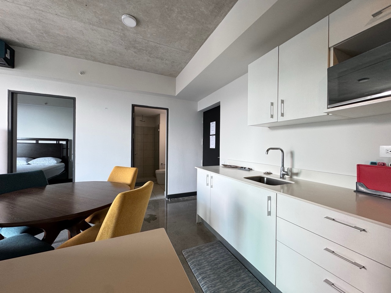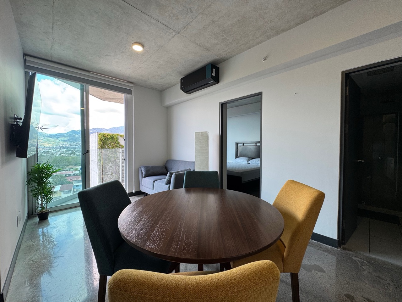 Distribución: 2 habitaciones, 1 baño completo y 1 parqueo. Ubicado en el piso 9, esta unidad destaca por ser más amplia que el promedio, con un balcón extendido y vistas a las montañas de Escazú.