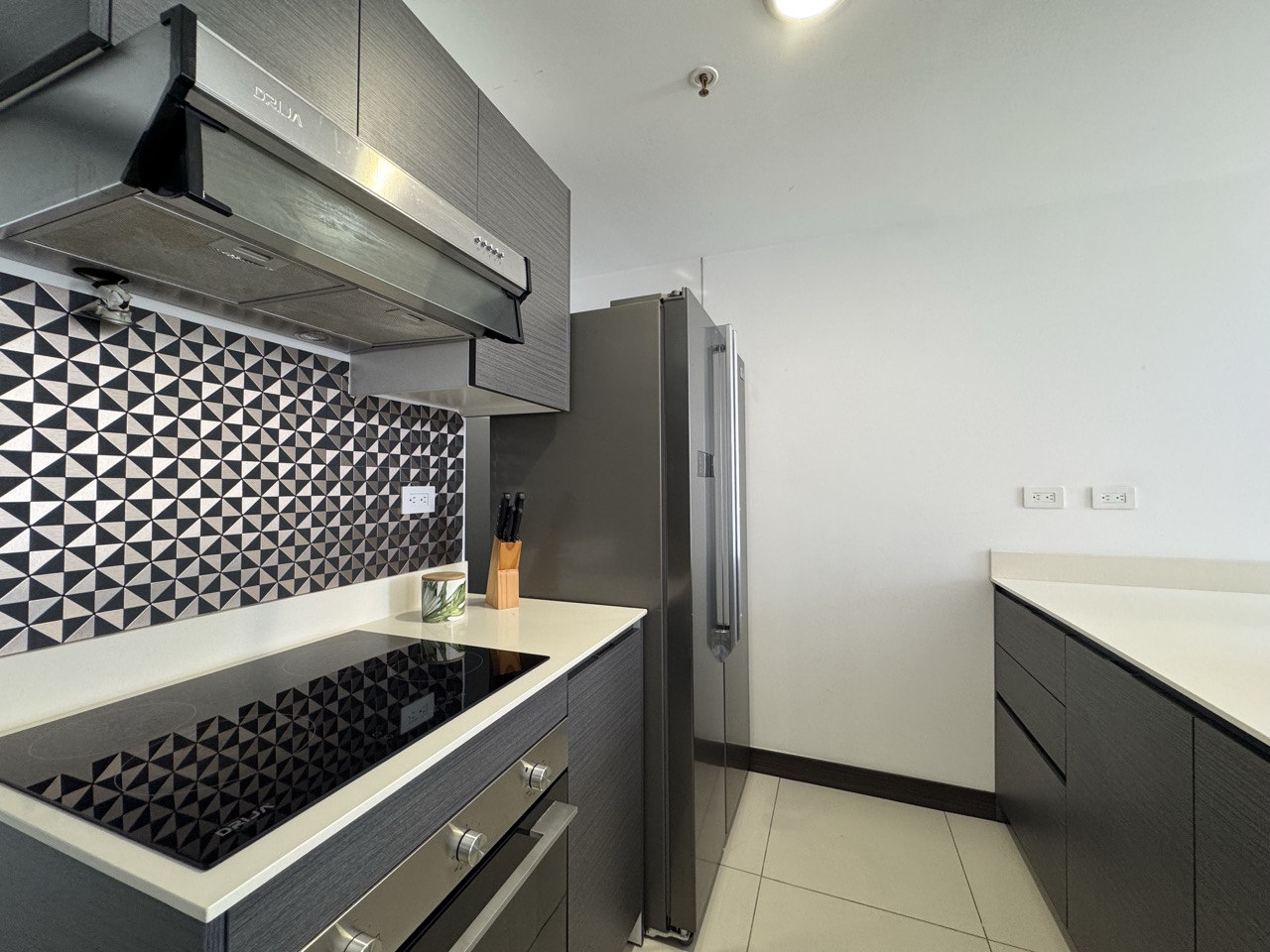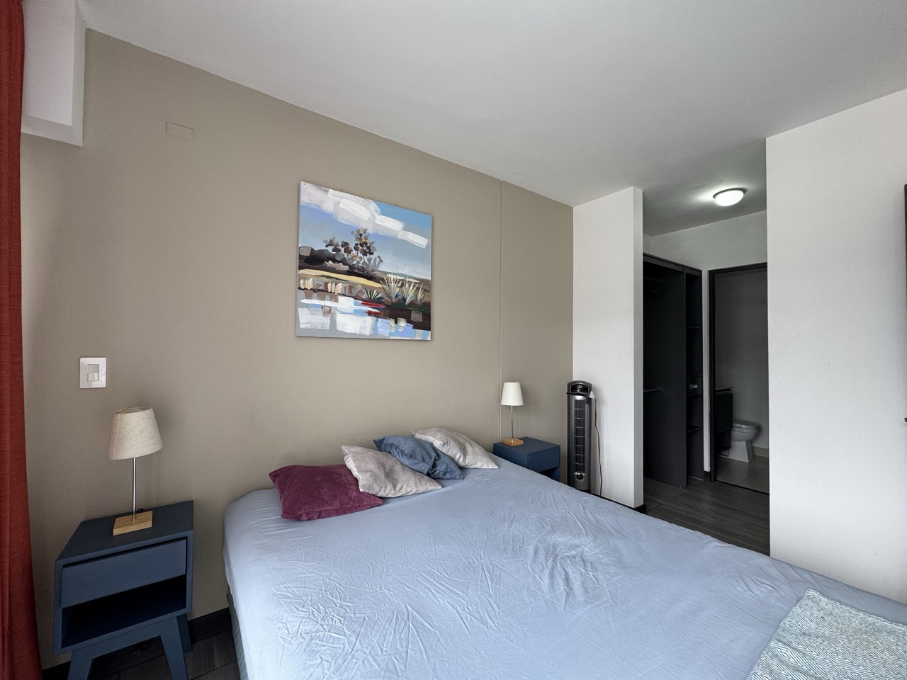 Sobres en cuarzo, abanicos, cortinas, blackouts y pisos de porcelanato.